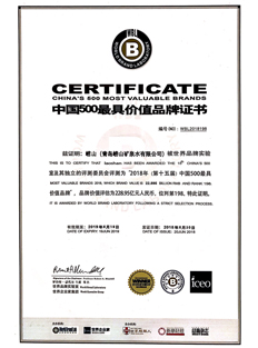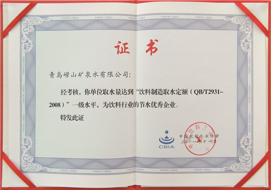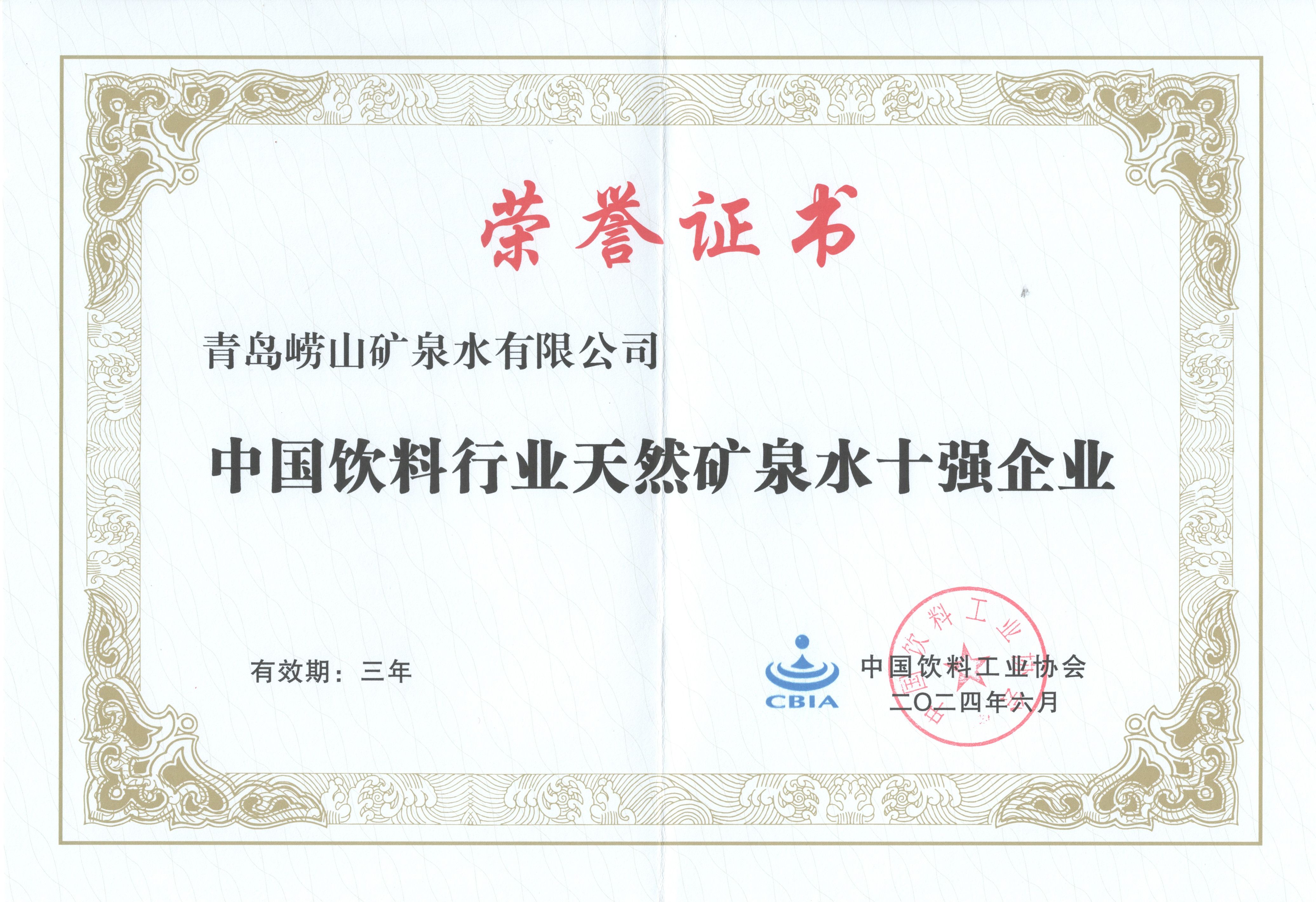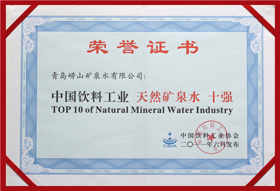 崂矿公司获得中国饮料工业协会颁发的《中国饮料行业天然矿泉水十强企业》荣誉证书