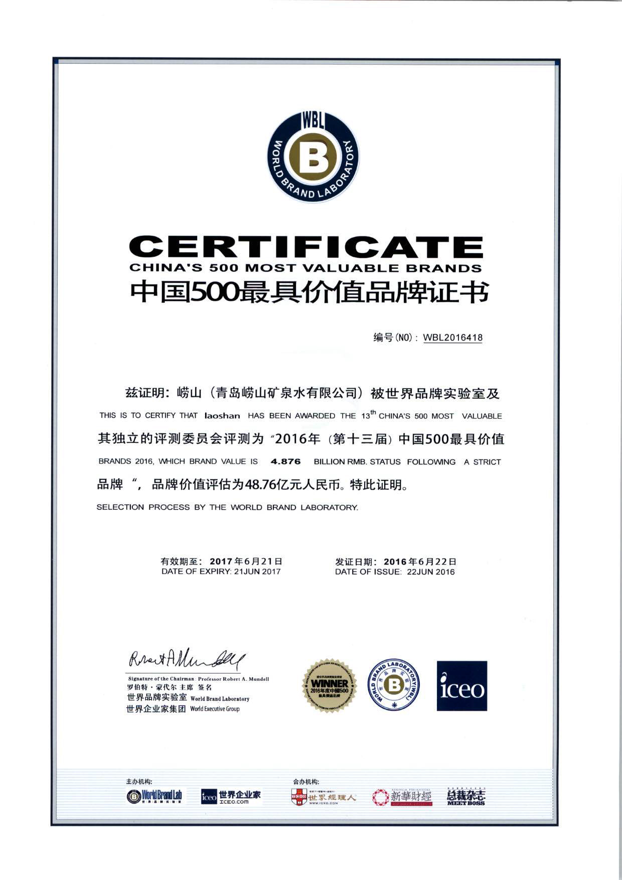 世界品牌实验室公布的2020年度“中国500最具价值品牌”榜单中,“崂山”品牌价值达到
