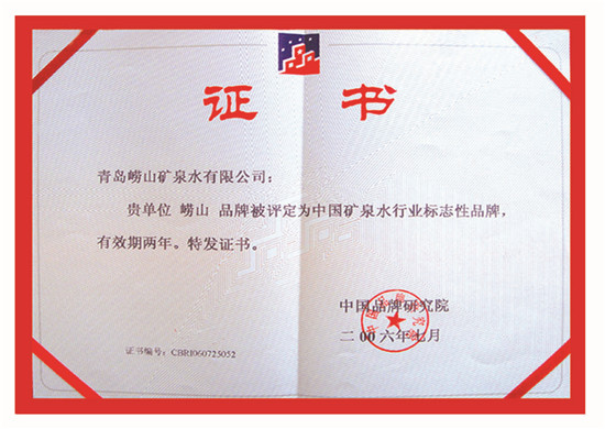 2006年7月 崂山矿泉水被中国品牌研究院评选为矿泉水行业唯一的“中国矿泉水行业标志性品牌”