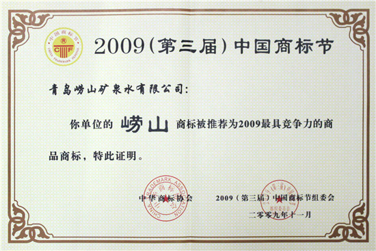 2009年11月 崂山矿泉水荣膺第三届中国国际商标节“最具市场竞争力的商品商标”