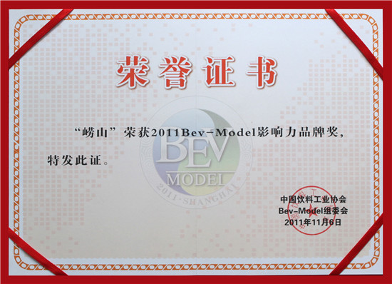 2011年11月 崂山矿泉水荣膺2011 Bev—Model影响力品牌奖