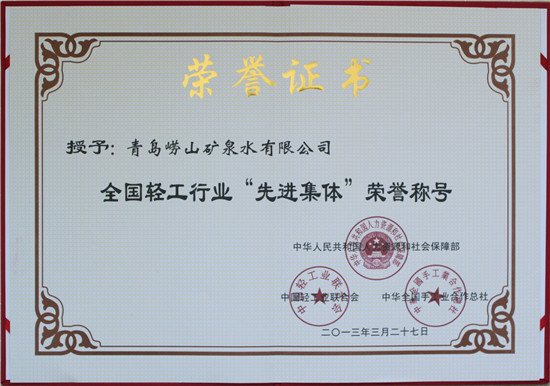 2013年3月 崂山矿泉水荣膺全国轻工行业“先进集体”荣誉称号