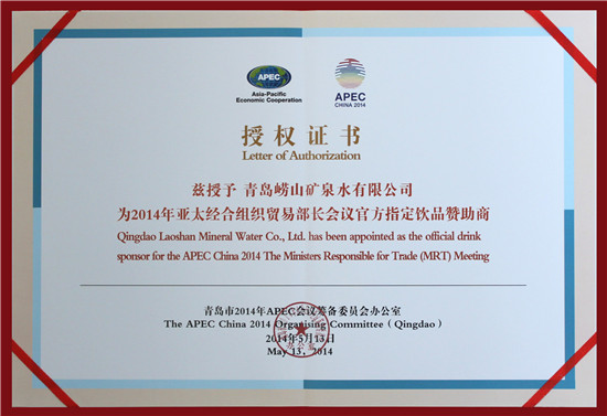 2014年5月 亚太经合组织贸易部长会议官方指定饮品赞助商证书